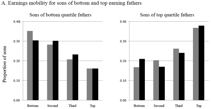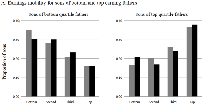 At the same time sons born to fathers in the top 25% show similar rates of mobility in both countries, over a third staying in the top 25% as adults, and about a fifth falling to the bottom.