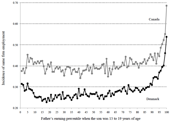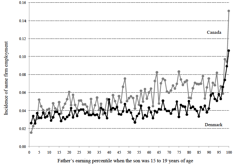 This pattern holds up when the focus is on the career employer, the employer accounting for the majority of earnings in adulthood, as the following picture shows. The chance a son of a top earning father is working for the same employer as his father did during the child’s teen years is over 10% in Denmark and about 15% in Canada.