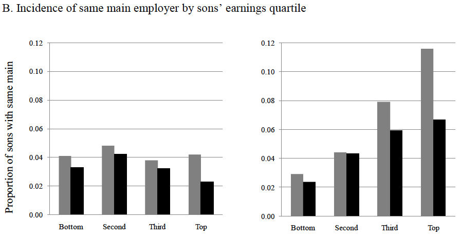 The fraction of sons working at the same employer as their father is the same for sons born to bottom-earning fathers whether they stay stuck in the bottom or move to the top, about 2 to 4%. But sons of high earning fathers are much more likely to be working at the same firm if they grew up to be high earners, than if they fell to the bottom. The two panels of the following figure illustrate.