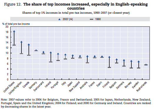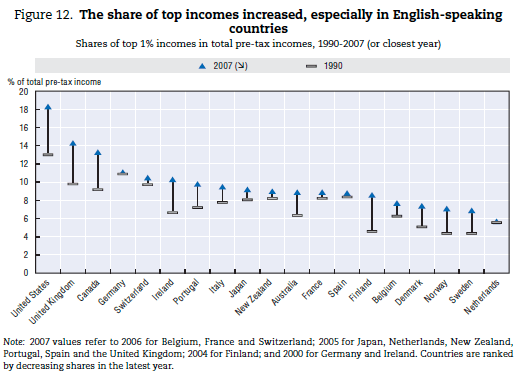 Occupy Wall Street focuses our attention on only one of these. But even so this is an important factor. You might have an interest in reading the very detailed book published by the OECD called “Divided We Stand”, where some attention is paid to determining the degree to which changes in overall inequality are due to changes in just the share of earnings/income accruing to the top 1%. But also because it very thoroughly discusses all the underlying causes of changes in inequality.