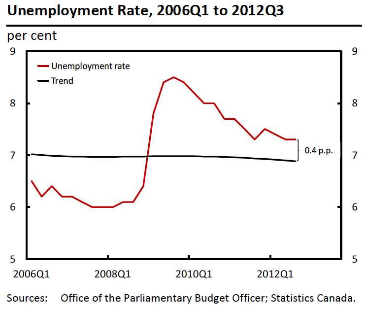 This is pretty clear with respect to the unemployment rate, which remains about one percentage point above its pre-recession level. But at the onset of the recession it was about one percentage point below its trend level—which the Parliamentary Budget Office estimates to be 7%—and is now only 0.4 percentage points above.