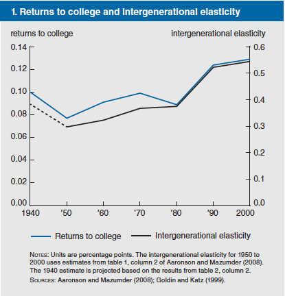 Mazumder’s juxtaposition of the patterns in the returns to college education and the degree of mobility are meant reflect the workings of the first two reasons: a higher return to college implies more inequality, which in turn implies that relatively well to do parents have both more resources to invest in their children, and more incentive to do so.