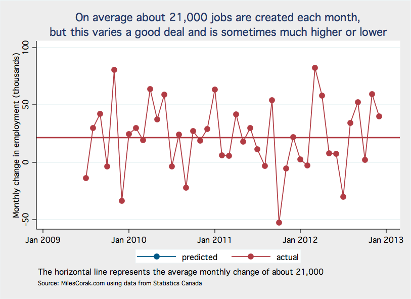 Since July of 2009, when employment bottomed out after the recession, the average monthly change has been 21,600. Exceptionally large differences from this figure probably imply a “bad” draw due to sampling variability, and are likely to be less extreme next month. But it is hard to see patterns in the deviations from the average. This is where the statistical modelling comes in. Some very simple analysis suggests that there is a pattern.