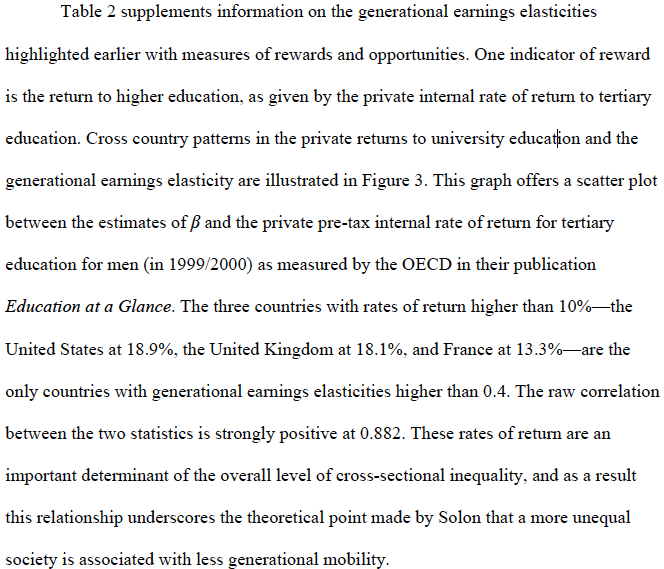 My version of the relationship sprang out of a comprehensive literature review of these estimates put together just after I had sent off the page proofs of a book I had edited on comparisons of intergenerational mobility between North America and Europe, which included a chapter—a theoretical chapter—by Gary Solon, the economist who repeatedly made important contributions to this literature during the 1990s.