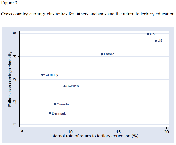 This inspired me to produce my version of the curve. In my mind Solon is the grandfather of The Great Gatsby Curve, and his thinking was directly inspired by two of the most influential theoretical papers in this field, both co-authored by Gary Becker and Nigel Tomes. I summarize these roots in a January 17th, 2012 post called “The Economics of the Great Gatsby Curve,” where you can also download a copy of Solon’s chapter.