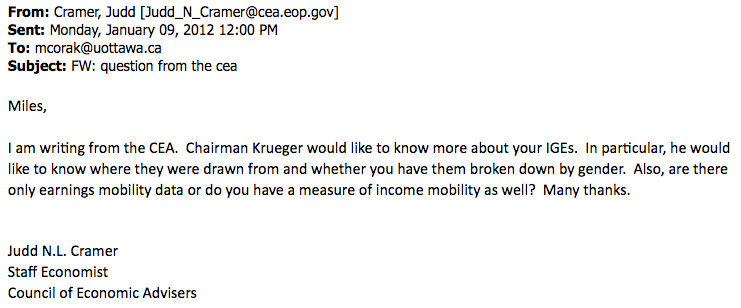 My email included a link to a blog post I wrote in the wake of the Occupy Wall Street protests. The post began “There is nothing wrong with inequality … until it starts limiting opportunity.” I suggested to Krueger that he check it out if he ever needed “a graph depicting the relationship between inequality and intergenerational mobility.”