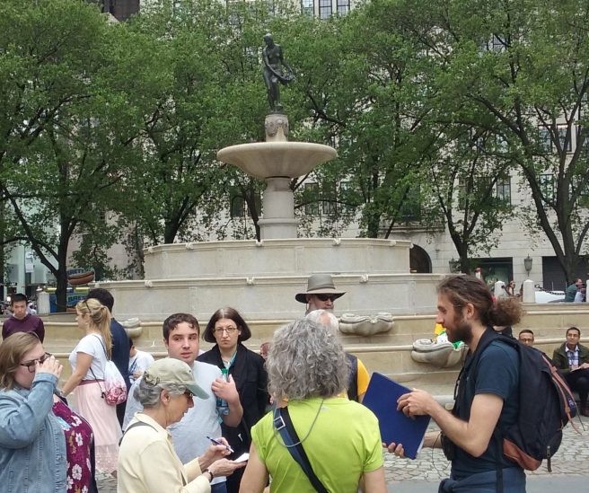 But this much I could get from my web search “Social Justice Tours engages New Yorkers in critical dialogue by exposing injustice & highlighting inequality in an effort to encourage thought & inspire action.” So who better than to run a Jane’s Walk—the grassroots celebration of the famous urban activist Jane Jacobs—called Trump Walking Tour.