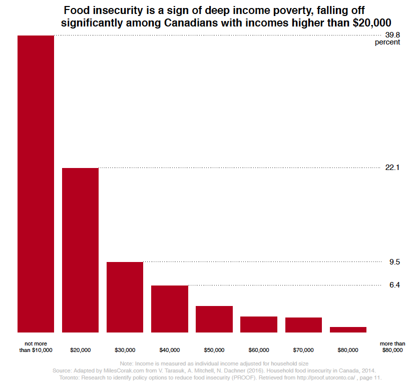 Valerie Tarasuk, who regularly reports on food insecurity with her colleagues at the University of Toronto, has said that “… food insecurity in Canada is unrelated to individuals’ skills in grocery shopping, food preparation, or cooking. Food insecurity is not a food problem, but rather an indication of profound material deprivation.”