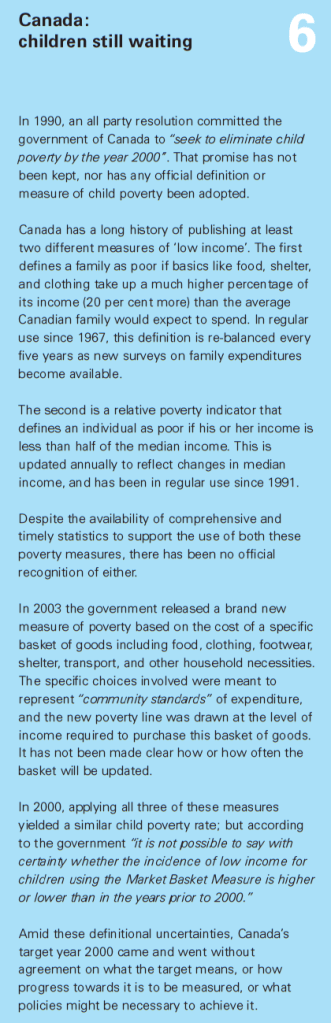 But this can at best be described as an “aspirational” target. In 2005 UNICEF reviewed Canada’s progress saying the promise “has not been kept, nor has any official definition or measure of child poverty been adopted.”