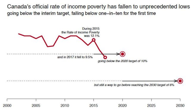 The Canadian federal government is about to pass a “Poverty Reduction Strategy” into law, defining an official poverty rate, clarifying in what ways progress will be measured and monitored, and using it to set challenging yet feasible targets. In fact, the overall poverty rate and the child poverty rate have experienced an unprecedented fall since 2015, likely as a result of a series of federal government initiatives.