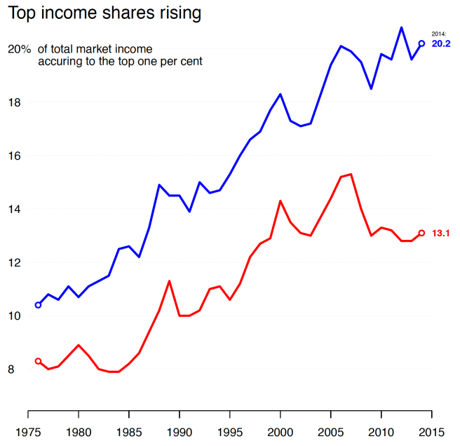 This is also clear in policies that impact inequality at the top. The Canadian federal government has raised the marginal tax rate on the rich, introducing an extra tax bracket for the top 1 percent, and more recently closed some loopholes associated the the preferential tax treatment of stock options and capital income. The US federal administration has cut taxes through the Tax Cuts and Jobs Act in a way that some estimate will be of disproportionate benefit to the richest Americans, and likely to increase federal deficits and limit future spending.