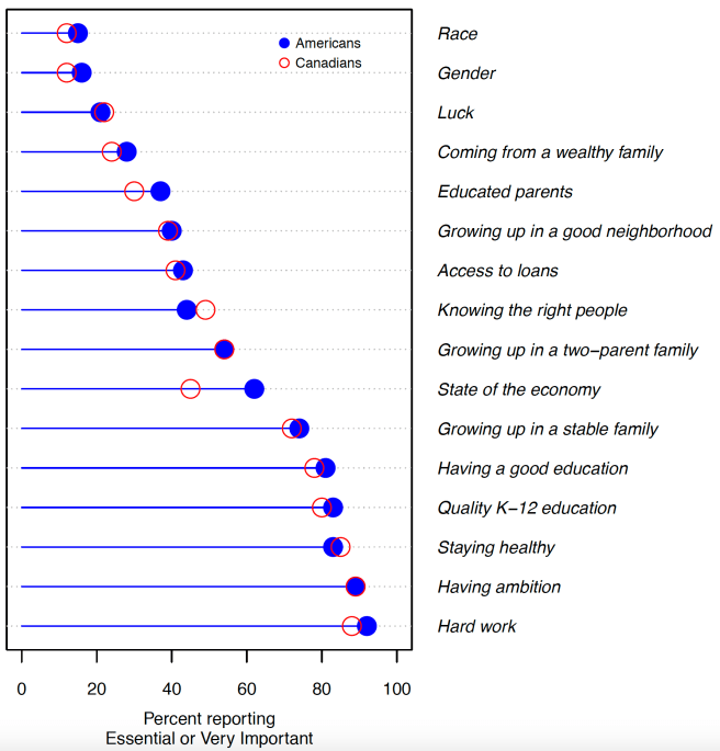Ninety-two percent of Americans and 88 percent of Canadians report that “hard work” was either essential or very important in determining upward mobility, and 89 percent in both countries felt this way about “having ambition.”