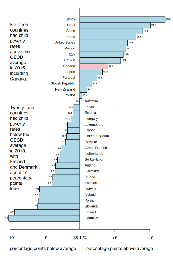 Australia finds itself at about the average, with 13 out of every 100 children living in households with low income during 2015. My country, Canada, is well above this average but more recent data for 2017, released by Statistics Canada and also the OECD, shows an important drop, documenting rates below the overall rich country average, and now below that for Australia