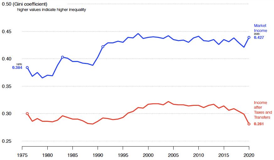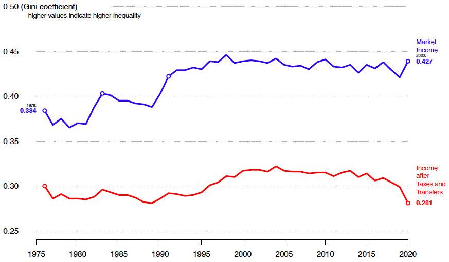 But strikingly this increase was more than completely undone by the tax-transfer system, the associated Gini falling to its lowest level in 45 years.