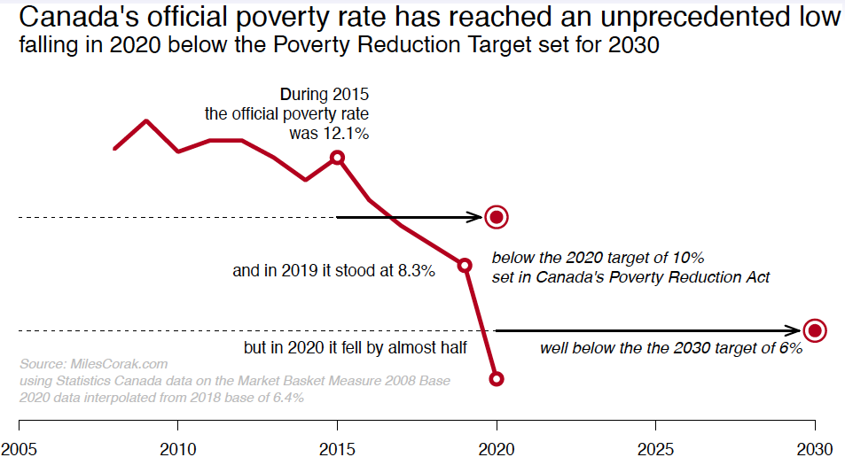 The Canada Emergency Response Benefit (CERB) clearly demonstrated the power of federal income transfers to lower the poverty rate. In fact, the official poverty rate fell by almost one-half between 2019 and 2020 to reach an unprecedented low, well below the poverty reduction target the federal government set for 2030.