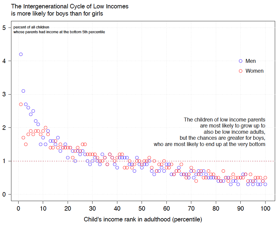 This inter-generational cycle of low-income is more likely for boys. Although there is considerable upward rank mobility among these children, men raised by parents who were outranked by 95 percent of their counterparts are most likely to fall even lower, to be outranked by 99 percent of their cohort. Their chances of falling to the bottom 1 percent are more than 4 percent.