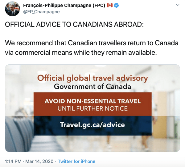 If that wasn’t enough to give me pause, when I saw the twitter feed of the Minister of Foreign Affairs on Saturday evening recommending “that Canadian travellers return to Canada via commercial means while they remain available” I immediately bought myself a ticket for a next day flight to Canada. I arrived last Sunday evening, and have been in self-isolation since. I’m glad to be home given the events of the last week.
